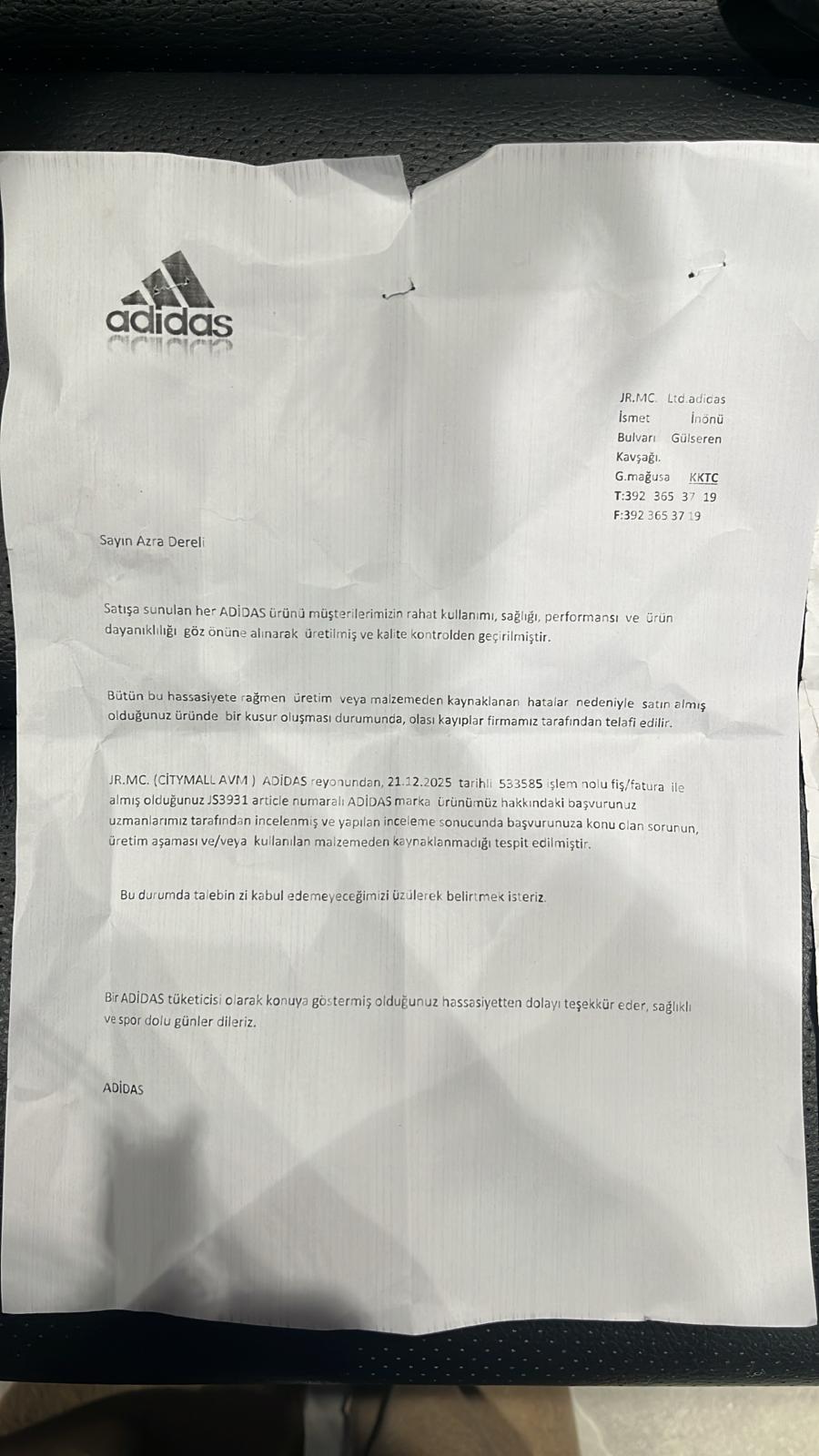 Adidas firmasının standart prosedürlerine göre incelemeye alınan ürünler için tüketiciye SMS veya telefon yoluyla bilgilendirme yapılması gerekirken, tarafıma hiçbir bilgilendirme yapılmamıştır.