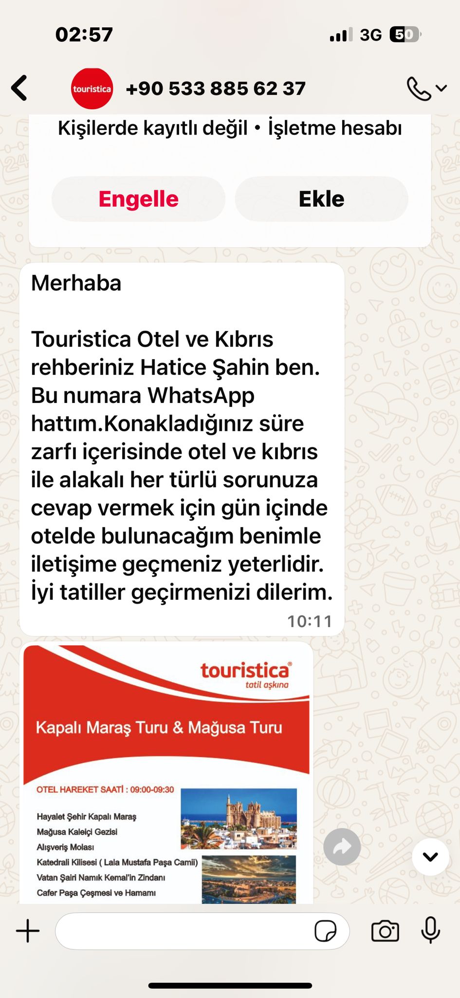 Touristica’nın otelde görevli rehberi sabah bana mesaj atarak: