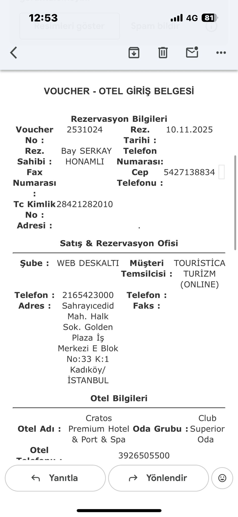 10 Kasım’da Touristica üzerinden Cratos Premium Hotel için kesin rezervasyon yaptım ve ödememi gerçekleştirdim. Aşağıda detaylarını paylaşacağım süreç yalnızca bireysel bir sorun değil; KKTC turizmine ve devlet itibarına doğrudan zarar veren, dolandırıcılık şüphesi yaratan ciddi bir ihlaldir.