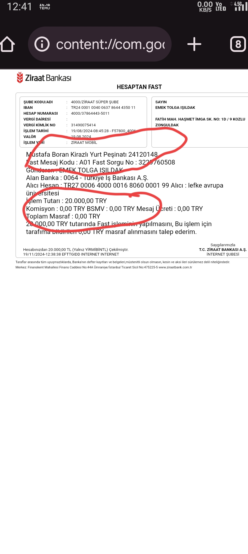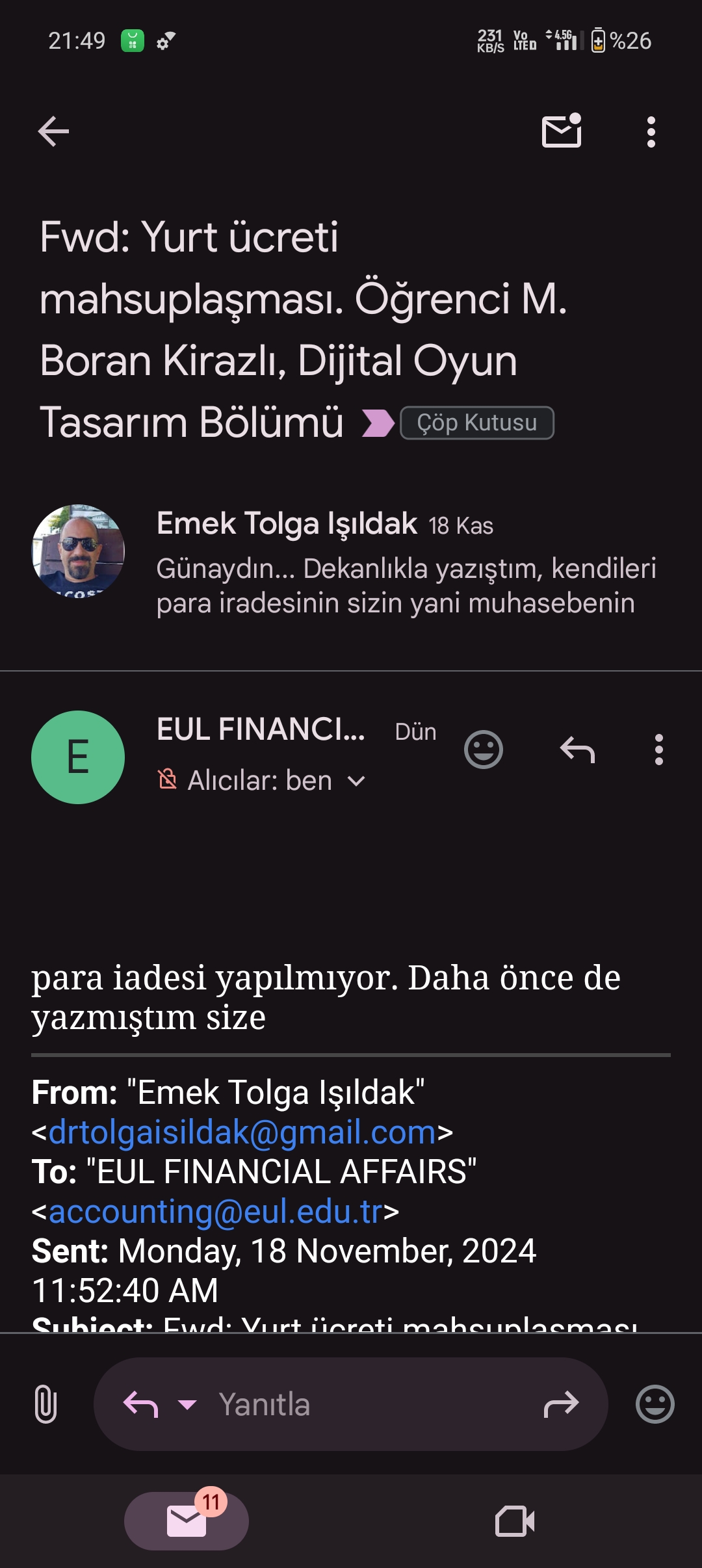 Geçtiğimiz Ağustos ayında Lefke Avrupa Üniversitesi Dijital Oyun Tasarım bölümüne (öğrenci no 24120148)oğlum Mustafa Boran KİRAZLI nın kaydını yaptırdım. Üniversiteye ait Merkez Öğrenci Yurduna yerleştirdim. Ancak;Yurdun okula uzak oluşu, daha önce 3 kişilik olduğu söylenen odada 4 kişi ve 3 kişisel dolapla konaklayacağı, hijyen sorunu ve yeterli çalışma masasının bulunmaması nedeniyle oğlumu yurttan alarak daha yüksek bedelle ev kiralamak zorunda kaldım. Akabinde yurttan hemen dilekçe ile çıkışını yaptık. Yurtta görevli memur işlemlerin tamamlandığını söyledi.Her ihtimale karşı merkez kampüs yurt müdürlüğüne ve dekanlık öğrenci işlerinede bizzat bildirdik.e-mail atmamızı da söylediler onu da attık ancak geçen 2 aylık sürede oğlumun da defalarca yüz yüze muhasebe ve öğrenci işleri ile görüşmesine rağmen peşinat olarak hizmetini almadığımız yurdun parasının iade edilmeyeceği söylendi.Okul taksiti ile mahsuplaşılabileceğini de önermeme rağmen gerekçe göstermeden param iade edilmemiştir.Mağdur olduğum bu hususta gereği ve takibinin derneğinizce yapılacağından şüphemiz yoktur.